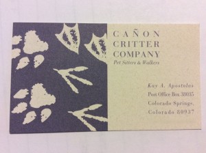 Established in 1992, Canon Critter Company has been serving the Colorado Springs area for 25 years. In 1995 I became a PSI member and have been bonded and insured since that time. As a professional full-time pet sitter my service is customized around your pet's normal schedule. Canon Critter Company offers a variety of services: midday visits, dog walking, petsitting, vet appointments and supply runs. My experience also includes administering oral medications and injectables. All standard visits are one-half hour in length and can be adjusted according to your needs. The benefit of in-home care is that your home security is maintained with mail and paper retrieval, alternating lights/curtains, and plant watering. Additional services are negotiable. Canon Critter Company ensures strict confidentiality. A free consultation visit is provided for a meet-and-greet with you and your pets. Adjectives used by my clients to describe Canon Critter Company - conscientious, caring, loyal, dedicated, reliable. The result is your animals feel and act calm when you arrive home. Please call Canon Critter Company for loving, fun care of your pets.